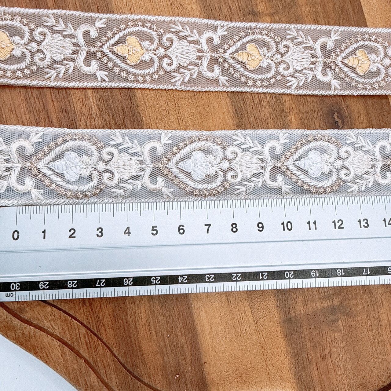 刺繍の特性上、同じリボンでも場所によって幅が数ミリ前後する場合がございます。